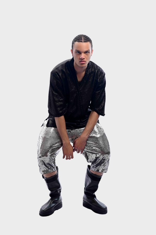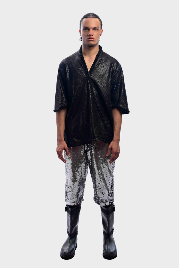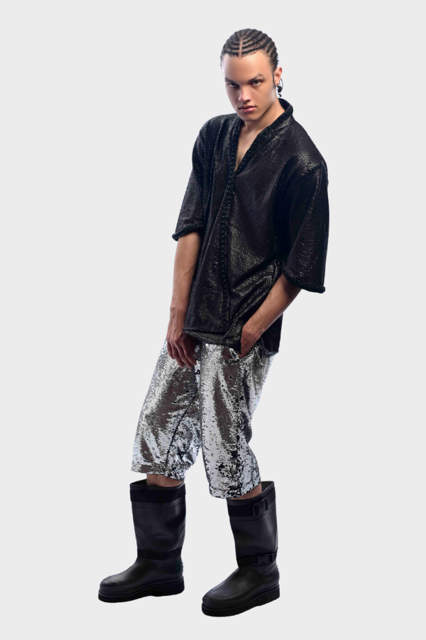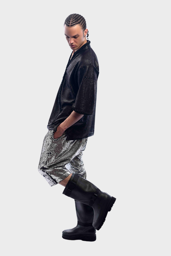 Style features a matte black sequins elbow sleeve blouse shirt with black decorative embellishment on the edges. Look also features a shinny silver sequin pair of shorts.