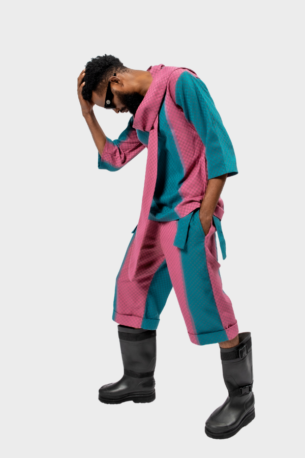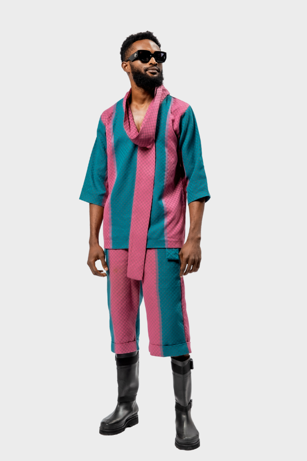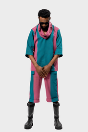 Shop the Nazarene Amictus cubic square pattern two color tone set of Rose pink and Tiffany blue comes with a pair of three-quarter shorts with side fastening ropes and a V- neck scarf inspired lapel collar three-quarter sleeve top designed to lift spirits by the use of vibrant colors with an exuberant yet ancient outlook.