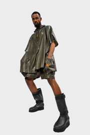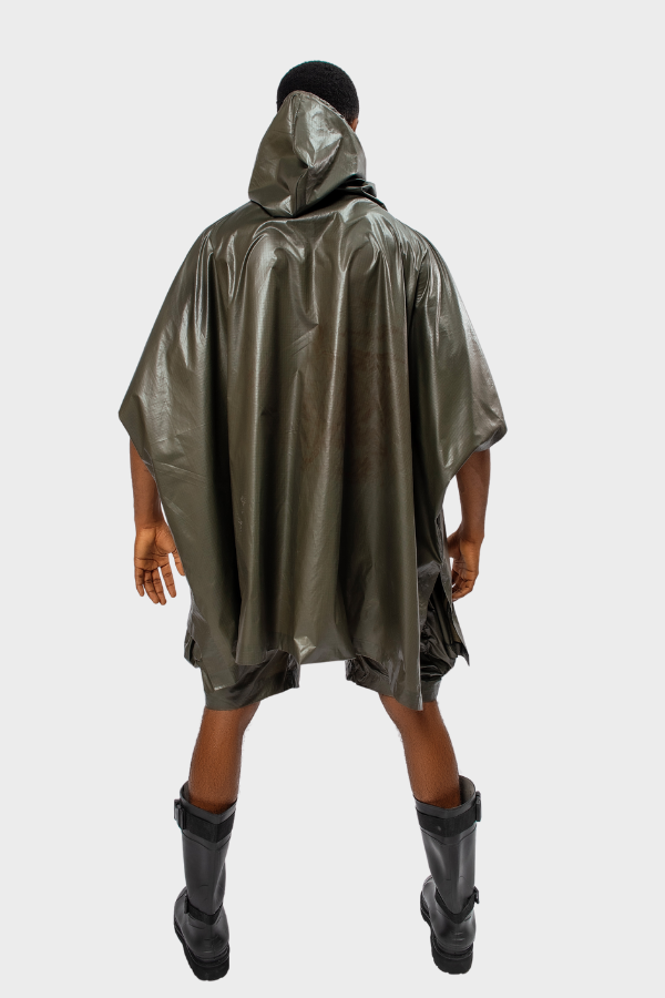 The Nazarene Amictus multipurpose highly fashionable Poncho gear is a unisex set of waterproof hoodie top with matching shorts in army green and camouflage blue color textile.
