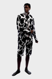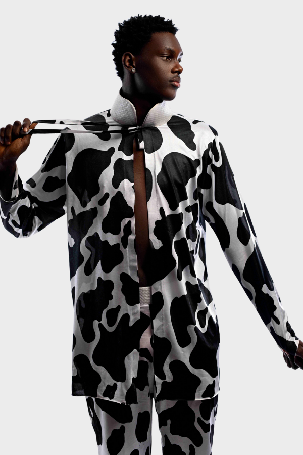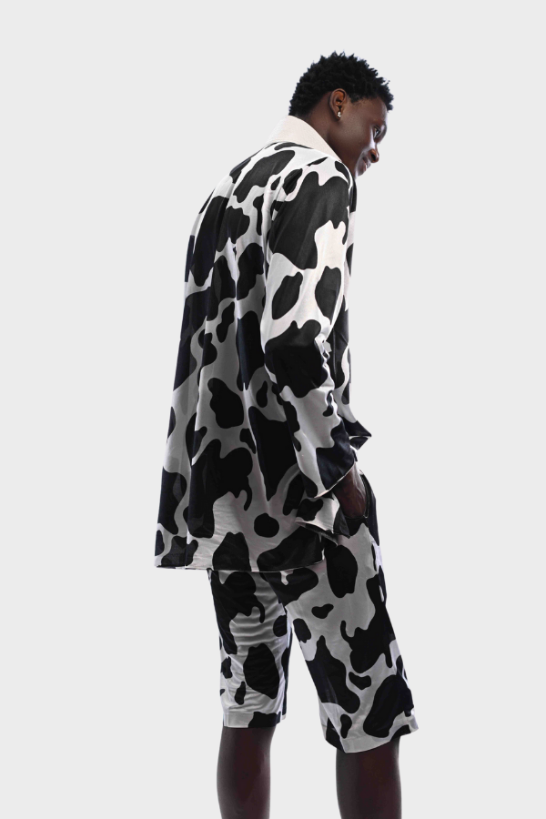 The effect of dazzling silver in appearance; shiny and grey-white, tailored as a sailor’s shirt with sharp blue opal animal print flap collar