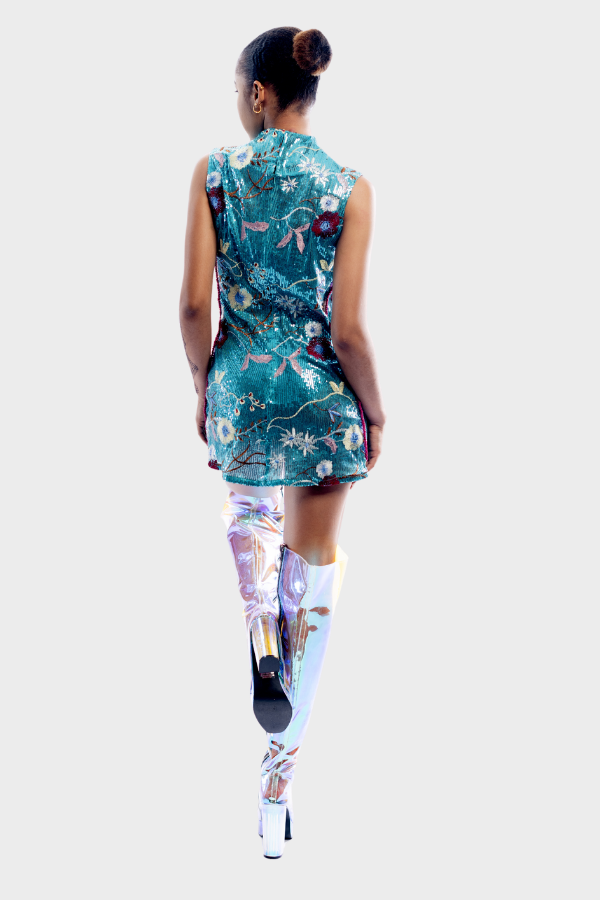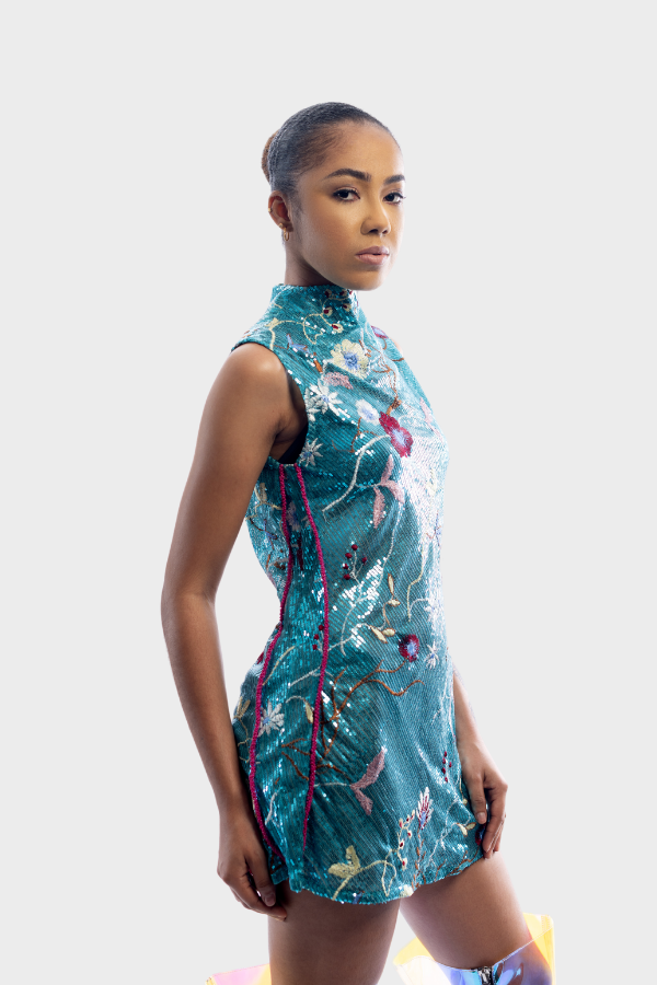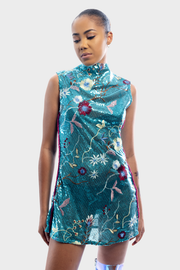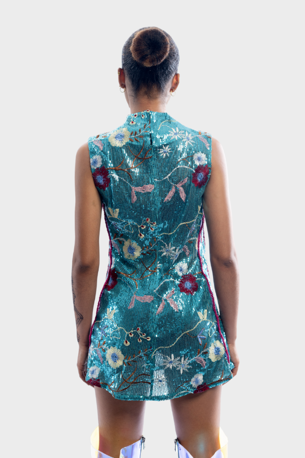 1. Price: $400 2. Uk Sizes (6 /8) 3. Product name: Ornamental Mini-dress 4. Description. Sea blue Sequin embroidered colorful motif short barbie dress is designed to lift spirits by the use of vibrant colors with an exuberant outlook.